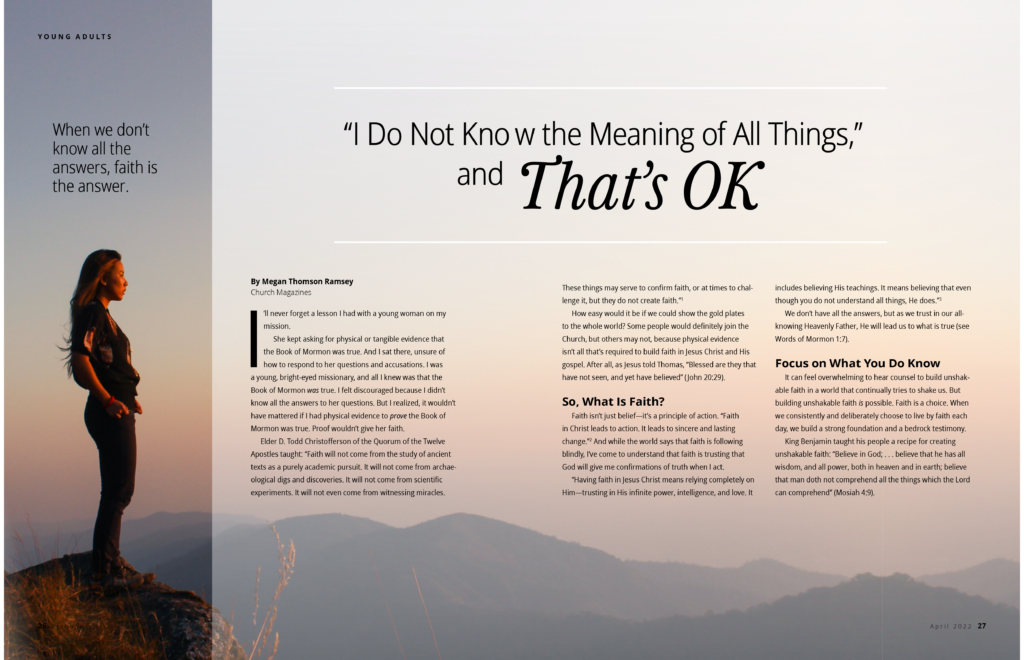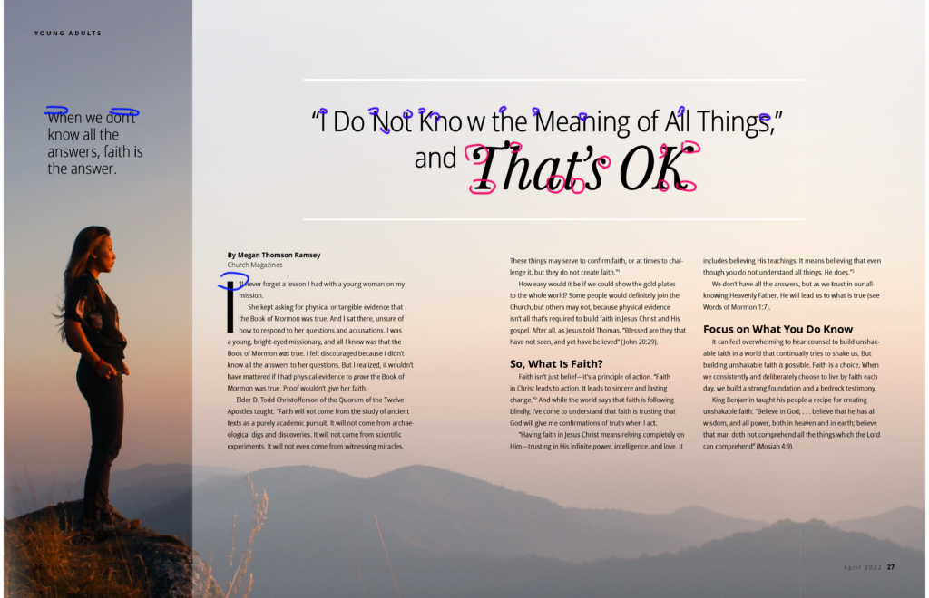 In the April 2022 Liahona, published by the Church of Jesus Christ of Latter-day Saints, an article was submitted by Sister Megan Thomson Ramsey, to Church Magazines. The article used an image of a young woman staring out into the horizon near sunset, where a range of foothills were softened by clouds or other filtering techniques. The foothills appeared less focused, compared to the subject. The photographer used depth of field to accomplish this visual treat. with that, the top of the peaks of the hills appear to barely scrape the bottom line of the “rule of thirds,” giving vastness to the sky above where the youth seems to be thoughtfully staring into. The typesets for the quote and text body are sans serif, while a short, two word response to a quote uses a serif font with decorative serifs.