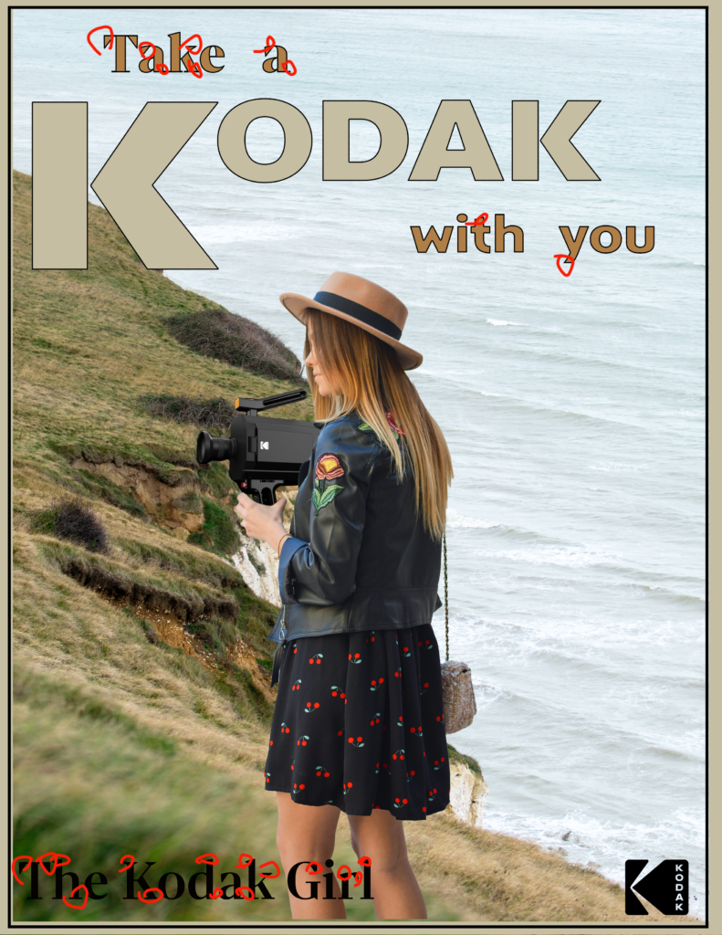 To tie into the original ad, I used the same font colors. I could not find the exact dress without recreating it, but the one this model is wearing exemplifies how the culture of the 1910s versus the 2020s might have differed. The subject appears to be at the same Cliffs or near it. The color scheme matches somewhat and lands close to home with the original. They are undoubtedly related but forward in time by more than a century. The hat and purse match the font vertically to the brand and what you see in some of the rocks. The grass, jacket, and skirt flash the same greens. The KODAK font color is also in the tan grass.