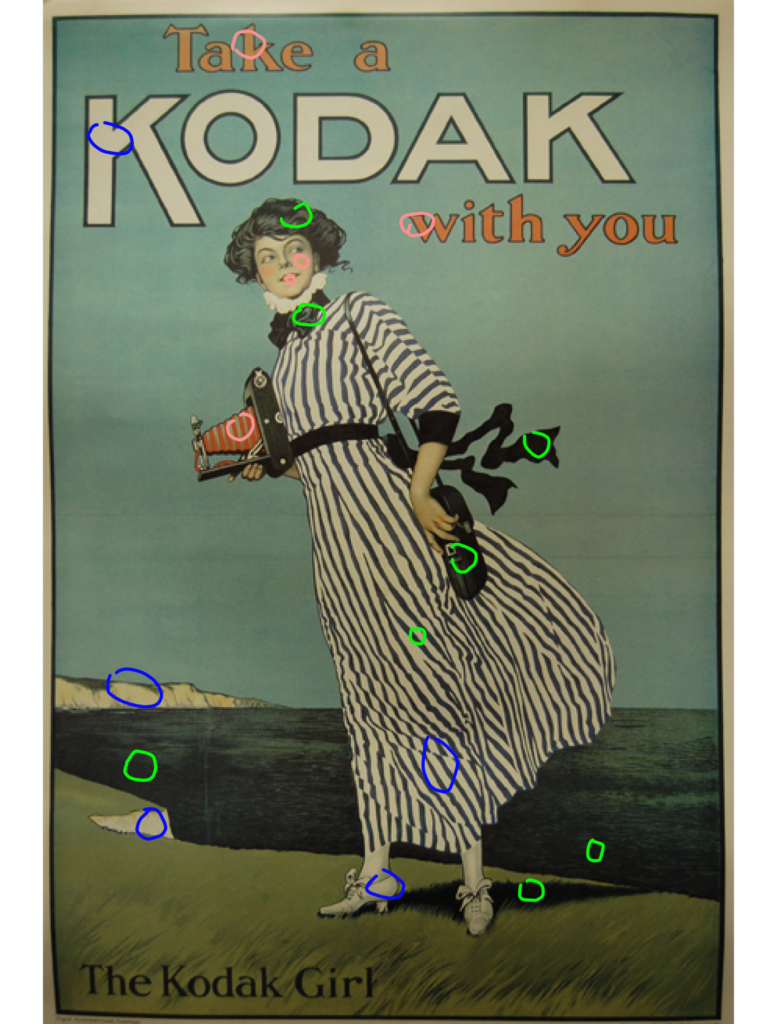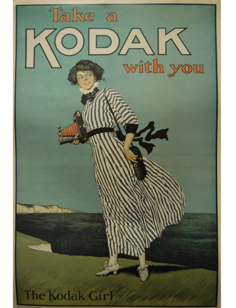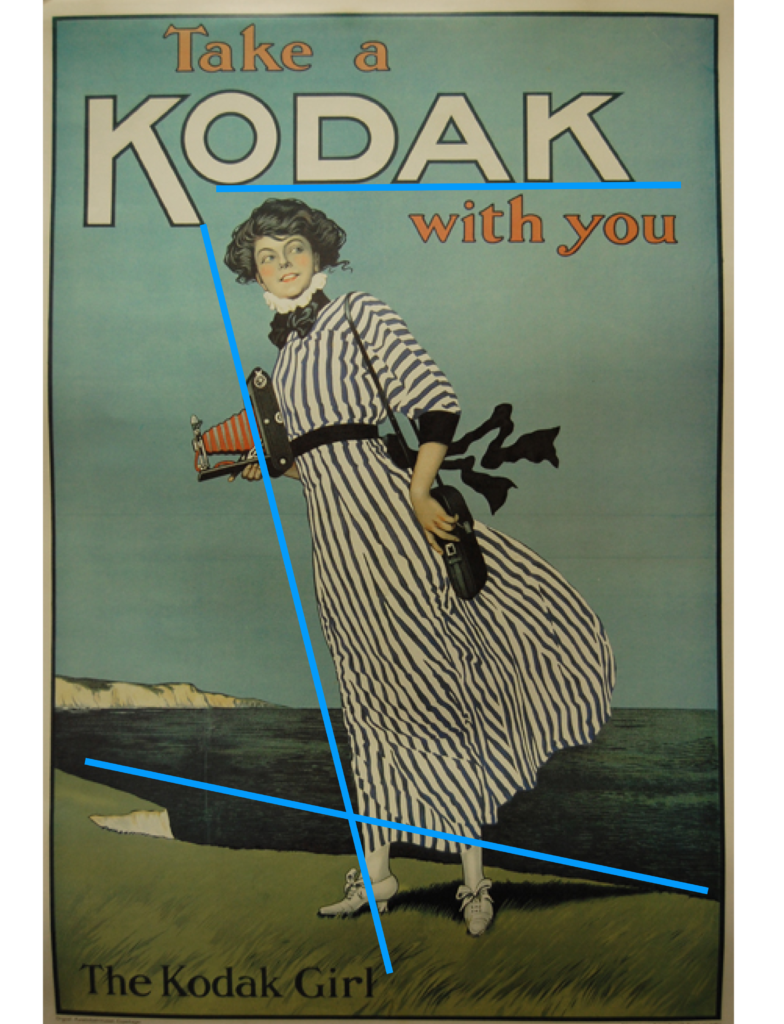 The lightest shade closest to cream can be seen in the font of KODAK, the cliff faces, the dress, and the shoes. This is an easy method of color coordinating, in which a drawing is ironically used to advertise a camera. Same for the darks in the handbag, ribbon sash, colonial tie, dress stripes, camera frame, the dark waters, and hair. The stroke of the font also has this dark tie-in. Finally, a rosy pink color graces, the lips and cheeks of the subject, while appearing in verticals to the KODAK brand and of the expanding body feature of the camera. These colors work in connection to one another to lend variety and control over the ad.