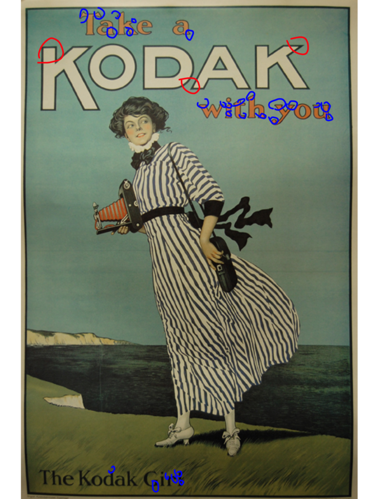 Albeit over a century’s old publication, they still had serif and non serif fonts. These worked together to give more variety to the viewer. The only non serif font is the brand name, KODAK, all in uppercase, and a preceding “K” in even larger font. This is in bold-white with a black stroke for boldness and obviousness. The softness of the embracing sentence, “Take a” and “with you” are in the rosy pink related to the woman’s makeup. I feel like this softens the visual and tames the large font of the brand name. I’ve queued many of the serifs in blue, and the non-serif in red.