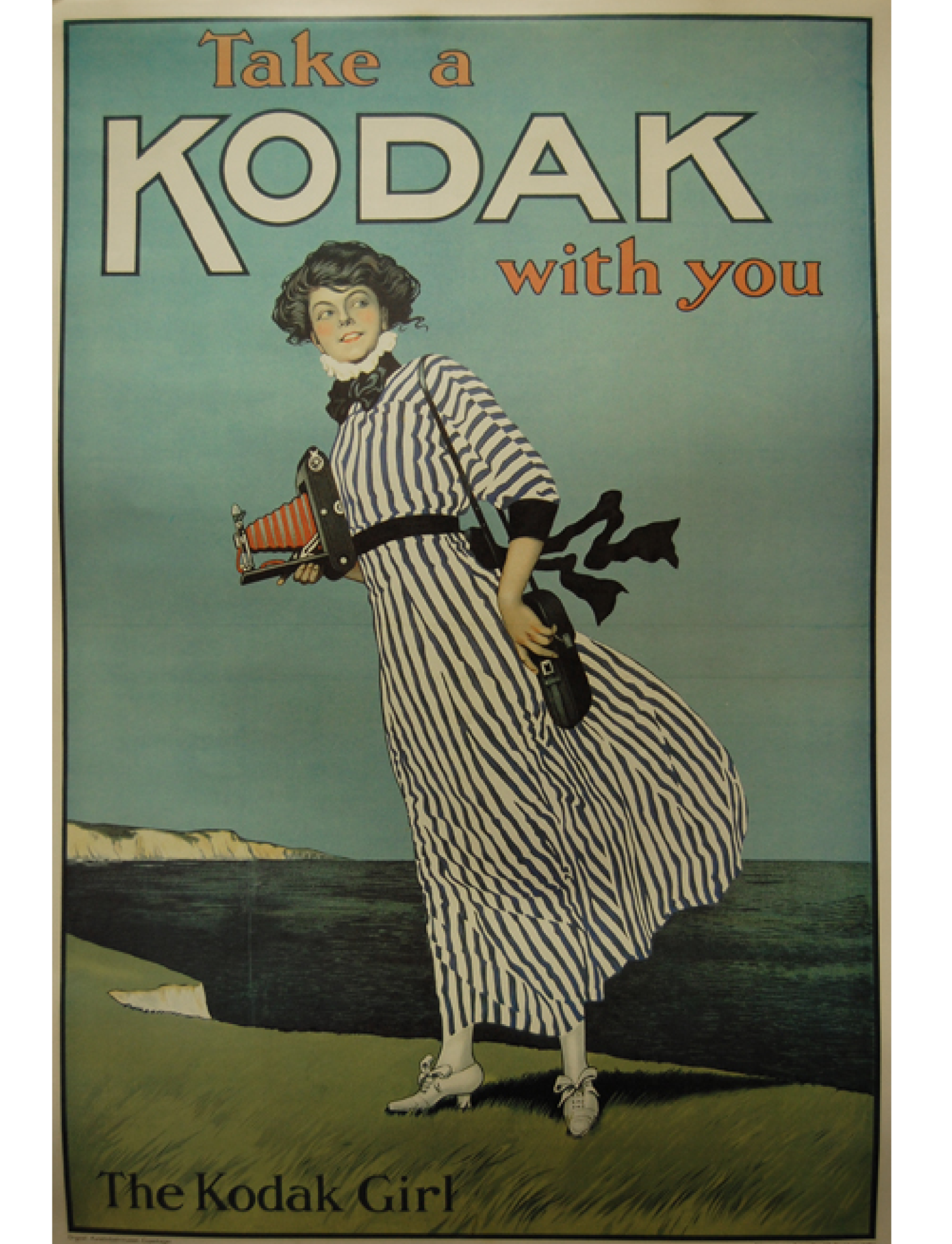 The lightest shade closest to cream can be seen in the font of KODAK, the cliff faces, the dress, and the shoes. This is an easy method of color coordinating, in which a drawing is ironically used to advertise a camera. Same for the darks in the handbag, ribbon sash, colonial tie, dress stripes, camera frame, the dark waters, and hair. The stroke of the font also has this dark tie-in. Finally, a rosy pink color graces, the lips and cheeks of the subject, while appearing in verticals to the KODAK brand and of the expanding body feature of the camera. These colors work in connection to one another to lend variety and control over the ad.